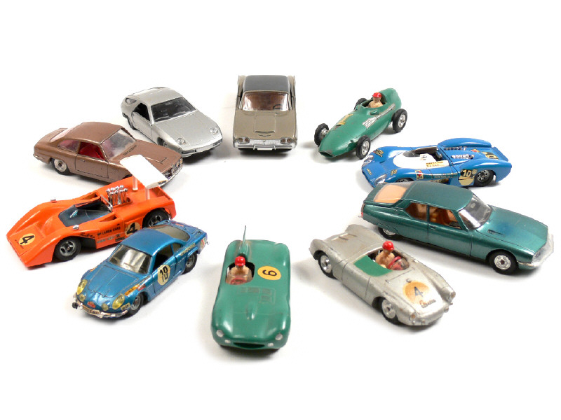 états de 'B' à 'D' - miniatures reproduisant les modèles : PORSCHE, ALPINE, JAGUAR, FORD, CITROËN (une partie de pare-brise fondue), ALFA ROMEO (en état 'E'), Mc LAREN, MATRA & VANWALL