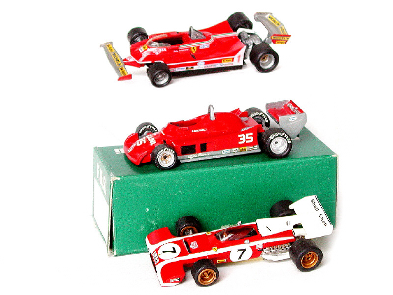 miniatures reproduisant les modèles : ALFA ROMEO 178 de 1979, FERRARI T5 de 1980 (coque amovible) & FERRARI 312B2 de 1972 - un véhicule sans boîte - petites pièces à recoller sur une voiture