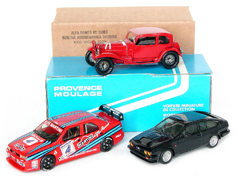 miniatures reproduisant les modèles : ALFETTA GTV6, 155 GTA (sans boîte) & 6C 1500S Touring Mille Miglia de 1929 (manque une poignée de porte) - on y retrouve les marques : PROVENCE MOULAGE & divers italie