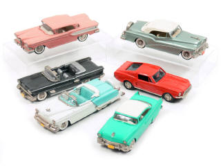 miniatures reproduisant les modèles : BUICK, EDSEL, FORD, OLDSMOBILE (manque un sigle de capot) & PONTIAC (traces d'humidités)